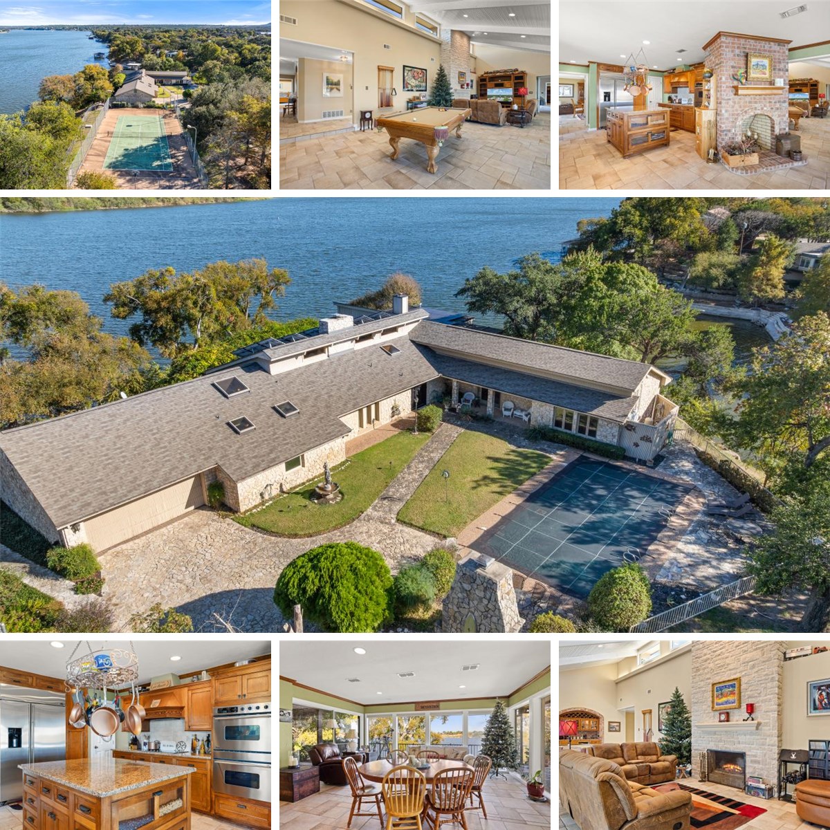 Welcome to an iconic Granbury waterfront retreat, where every day feels like a vacation. This incredible Lake Granbury home offers over 3,900 square feet of well-designed living space with four bedrooms and four bathrooms. The moment you step through the double iron doors, you're greeted by a breathtaking wall of windows showcasing expansive lake views from nearly every room. Perfect for relaxed living or entertaining, the home showcases two spacious primary suites, an updated chef’s kitchen, and an inviting living area that flows effortlessly outdoors. The extensive patio area is the ideal spot to unwind or host guests, complete with an outdoor fireplace and a refreshing in-ground pool. Whether you're sipping coffee at sunrise or enjoying evening breezes at sunset, the setting simply doesn’t disappoint. Sitting on 1.51 acres at the end of a quiet cul-de-sac, this property promises peace, privacy, and plenty of room to roam. With over 600 feet of prime water frontage, a deep-water boat dock, and space to expand it, lake living has never been easier—or more fun. In additional, this property consists of 4 lots. With a slight modification of the garage and the tennis court removed, 2 lots could be sold off separately. 65 roof mounted solar panels provide for drastically reduced electric bills! Bonus: You're tucked away just enough for solitude but still perfectly placed close to local attractions and conveniences. So whether you're seeking sanctuary, ready to entertain, or just want to collect a few adventurous fish tales or family boating fun,, this home is ready when you are.